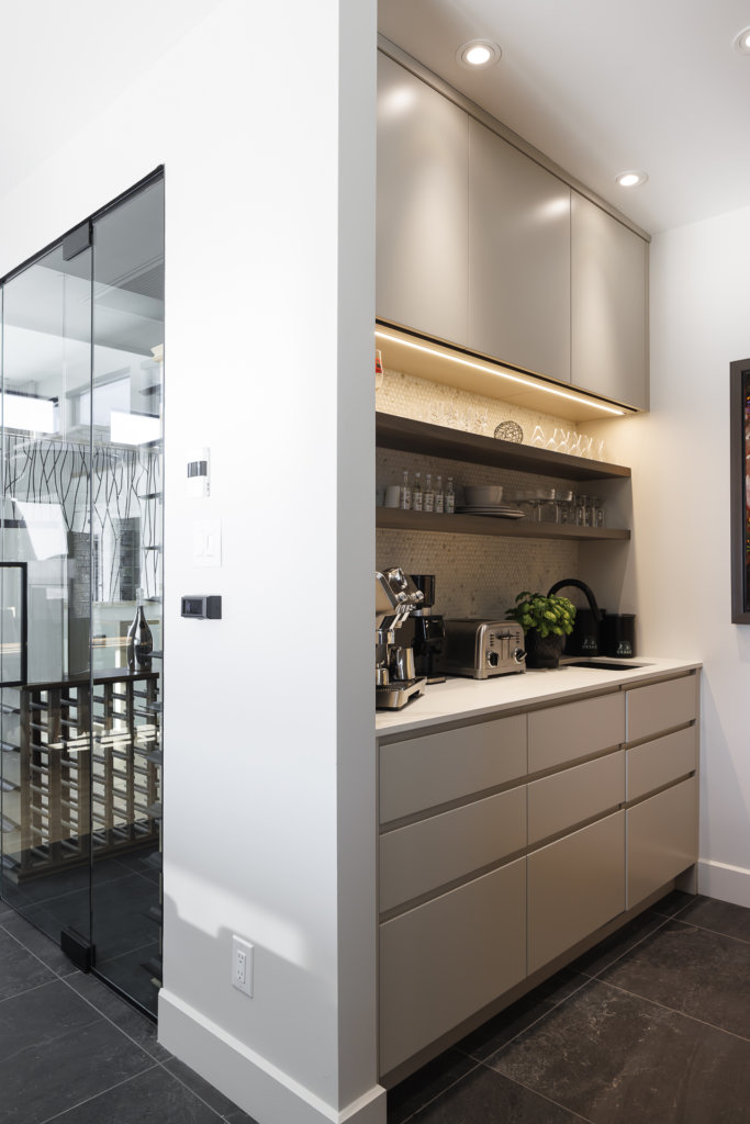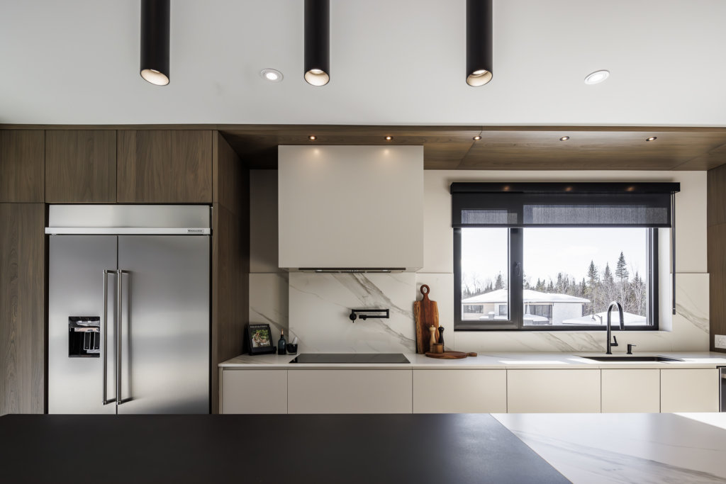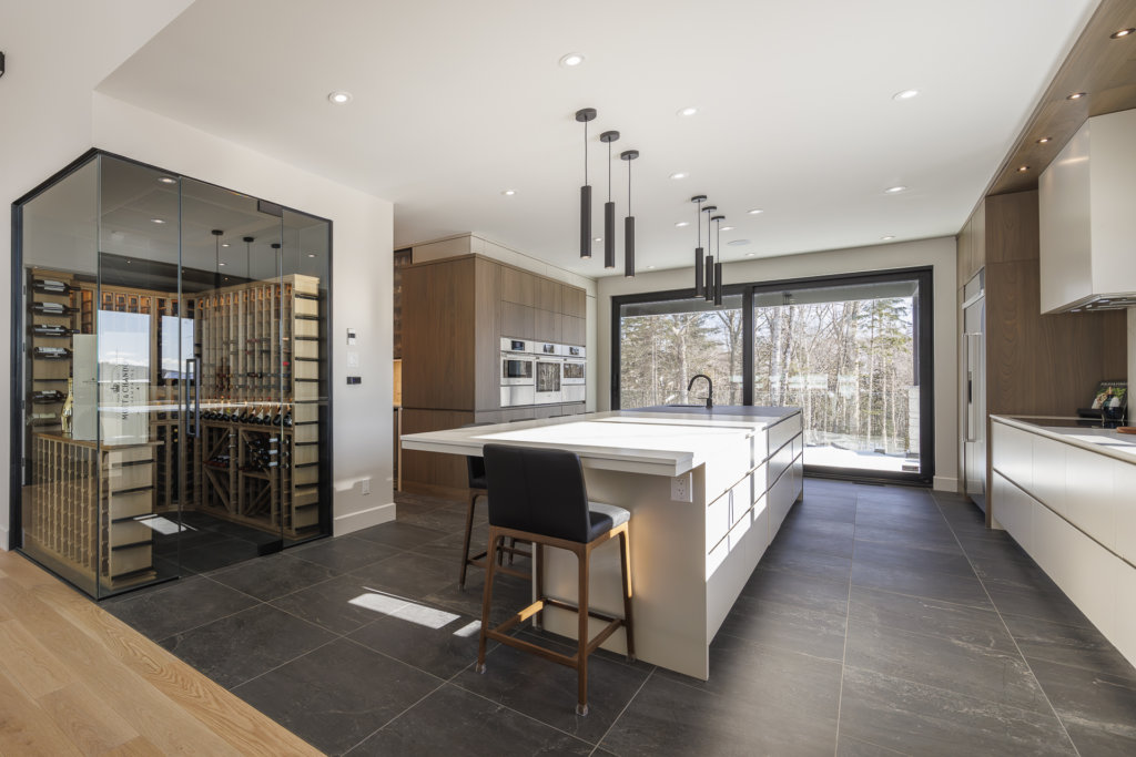Les propriétaires de cette résidence de Lac-Beauport ont confié la conception de cette cuisine moderne et haut de gamme à Richard & Levesque Cuisines Salles de Bain, et leur designer Marie-Ève Gendreault, en collaboration avec Construction René Hamel. L’intégration et la mise en valeur de l’imposant cellier ont servi de point de départ pour l’aménagement qui offre une zone de cuisson bien définie. Pouvant rassembler plusieurs personnes, la vaste cuisine est accueillante, fonctionnelle et dotée de rangements efficaces. Elle intègre des matériaux nobles et durables comme le Dekton, le MDF laqué ainsi que l’orme rouge, une essence de bois peu commune qui ajoute de la chaleur à l’ensemble.